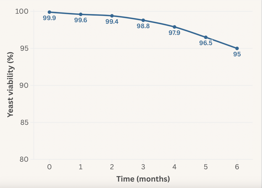 On the day of packaging, viability was >99.9% (it is never truly 100%, despite some claims). Over the next two months, viability remained above 99%, gradually decreasing to 95% by the sixth month (Fig. 1).