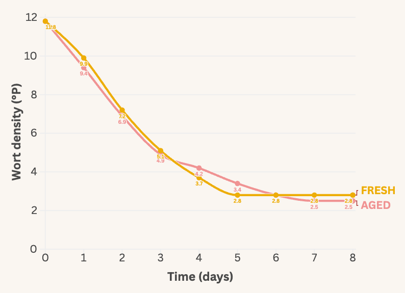- Fresh yeast reached the expected final gravity 1,5 days faster than stored yeast.